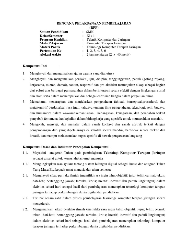 Rpp Xi Tkj Komputer Terapan Jaringan Kurtilas Semerter 1 Docx