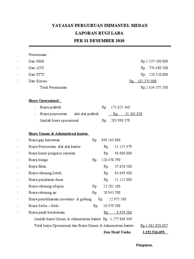 Contoh laporan laba rugi yayasan sosial. Salah satu contoh laporan laba rugi pada perusahaan jasa biasanya pada perusahaan jasa secara garis. Laporan laba rugi merupakan bagian dari laporan keuangan yang termasuk dalam rangkaian siklus akuntansi yang dihasilkan dalam satu periode akuntansi yang didalamnya menyajikan seluruh unsur pendapatan dan beban perusahaan yang akan menghasilkan kondisi sebenarnya laba bersih atau rugi bersih perusahaan. Cara mengisi SPT Tahunan Badan bagi Yayasan atau LSM kurang lebih sama seperti WP Badan lainnya antara lain.