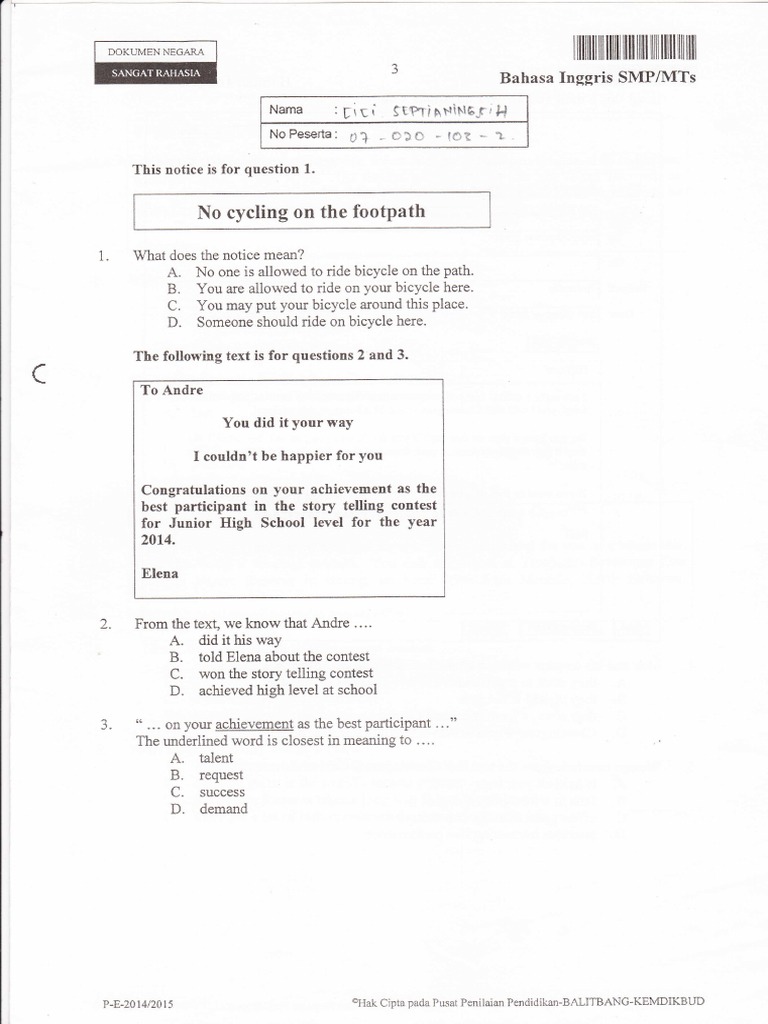 Soal Dan Kunci Jawaban Usbn Bahasa Inggris Smp Kurikulum 2013 Tahun Pelajaran 2018 2019 Didno76 Com
