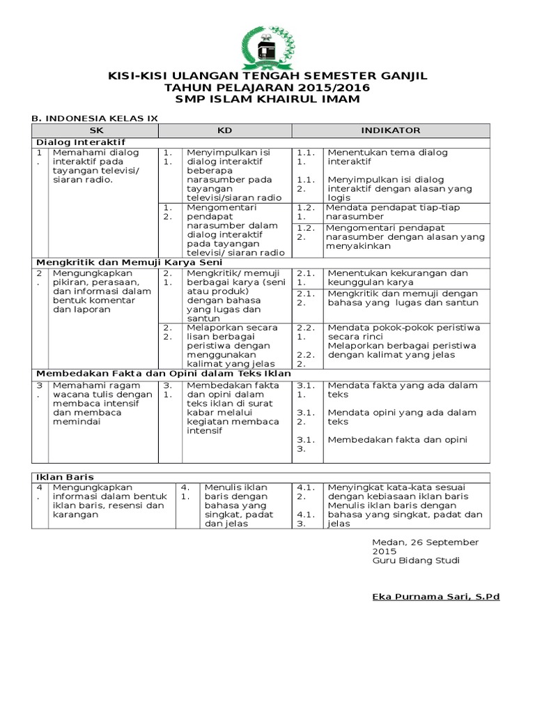 Kisi Kisi Bahasa Indonesia Kelas Ix 2015 2016