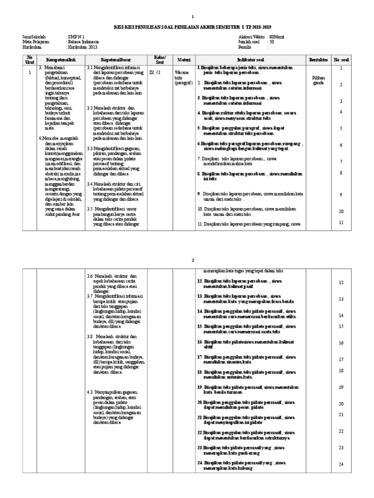 Kisi Kisi Pas Bahasa Indonesia Kelas 9 Semester 1 Kurikulum 2013 Revisi 2018