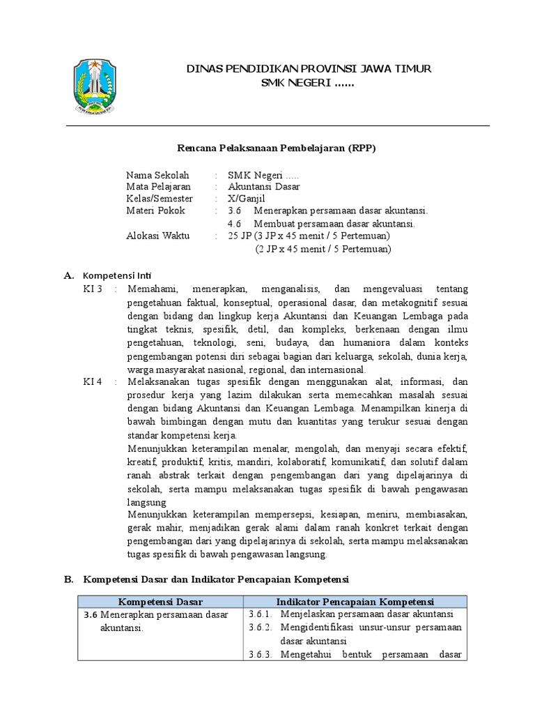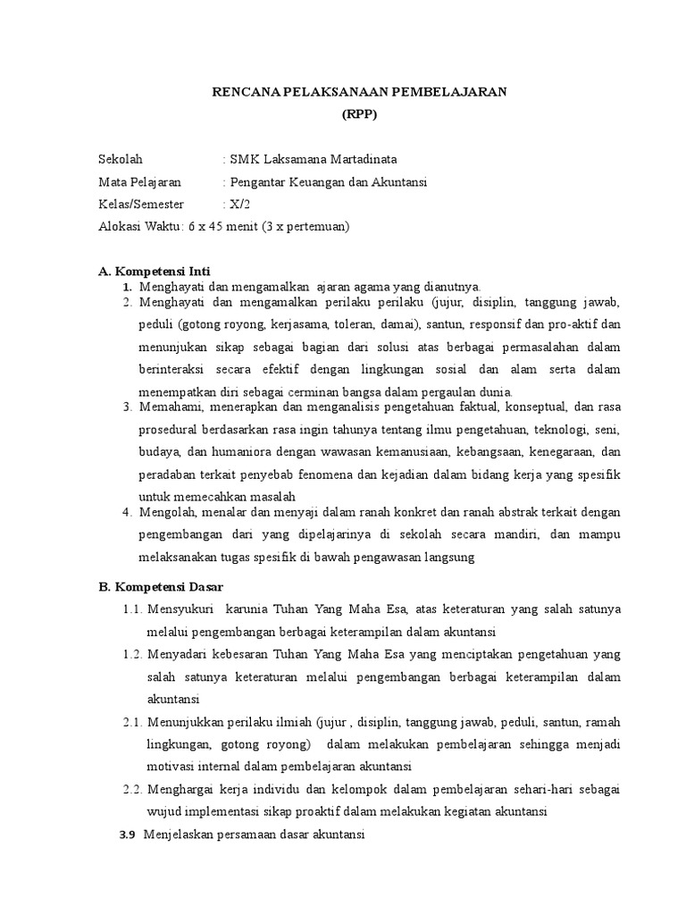Standar Kompetensi Persamaan Dasar Akuntansi. RPP Akuntansi SMK Kelas X Kurikulum 2013 Revisi 2017 Terbaru. RENCANA PELAKSANAAN PEMBELAJARAN KURIKULUM KTSP Diajukan untuk memenuhi tugas mata kuliah Telaah Kurikulum dan Perencanaan Pembelajaran Akuntansi yang diampu oleh Dr.