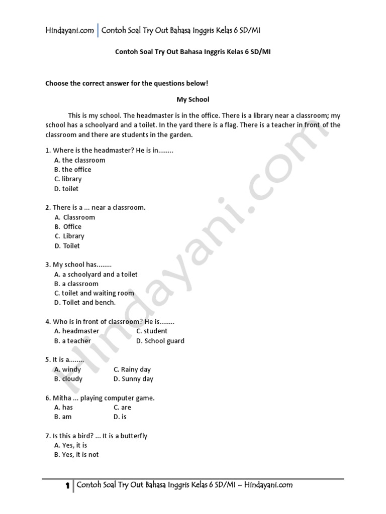 Latihan Soal Bahasa Inggris SD MI. Pdf Contoh Soal Try Out Bahasa Inggris Kelas 6 Sd Mi Eky Erlina. Kelas 6 Ujian Sekolah 20132014.