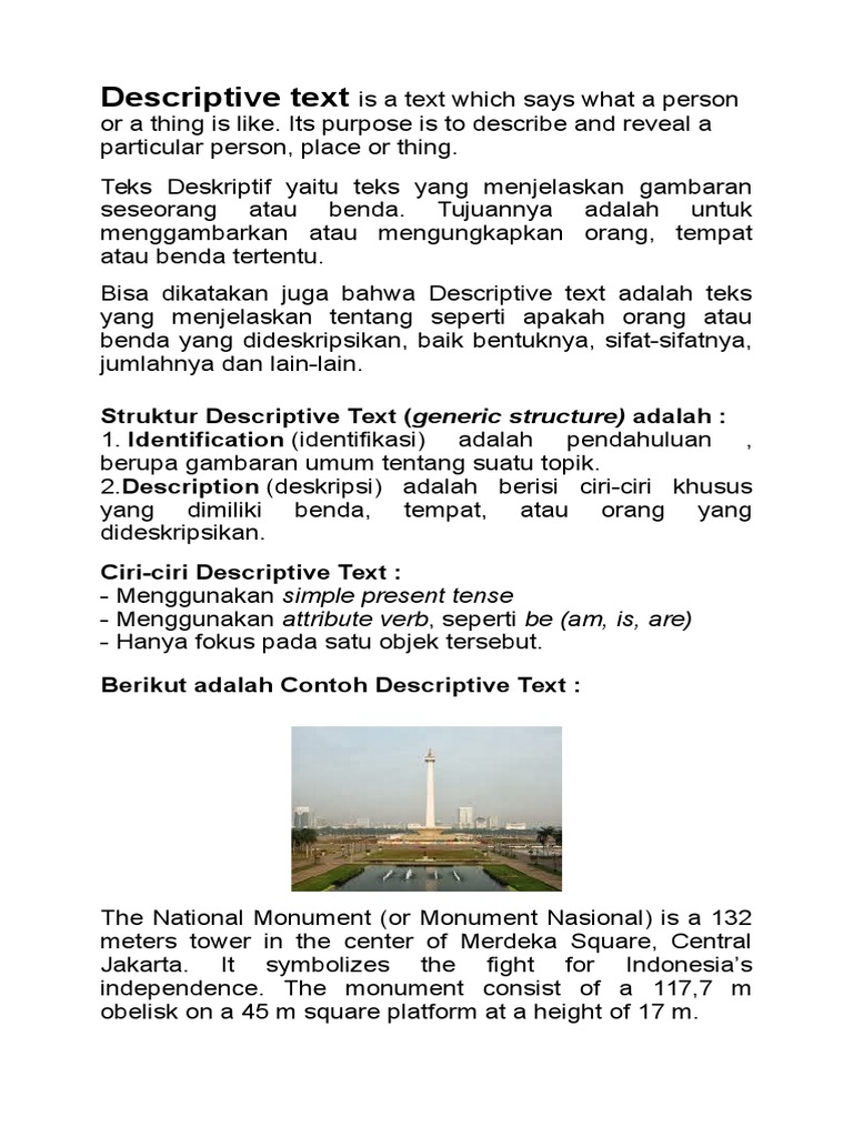An Example of a Descriptive Text. Descriptive text teks descriptive merupakan jenis teks yang banyak digunakan dalam kehidupan sehari hari dalam menggambarkan benda tempat manusia hewan dan lain sebagainya. Dalam Bahasa Inggris terdapat beberapa jenis text yaitu Narrative Report Descriptive Procedure Dan yang lainnyaDari jenis yang sudah disebutkan salah satunya adalah Descriptive Text.