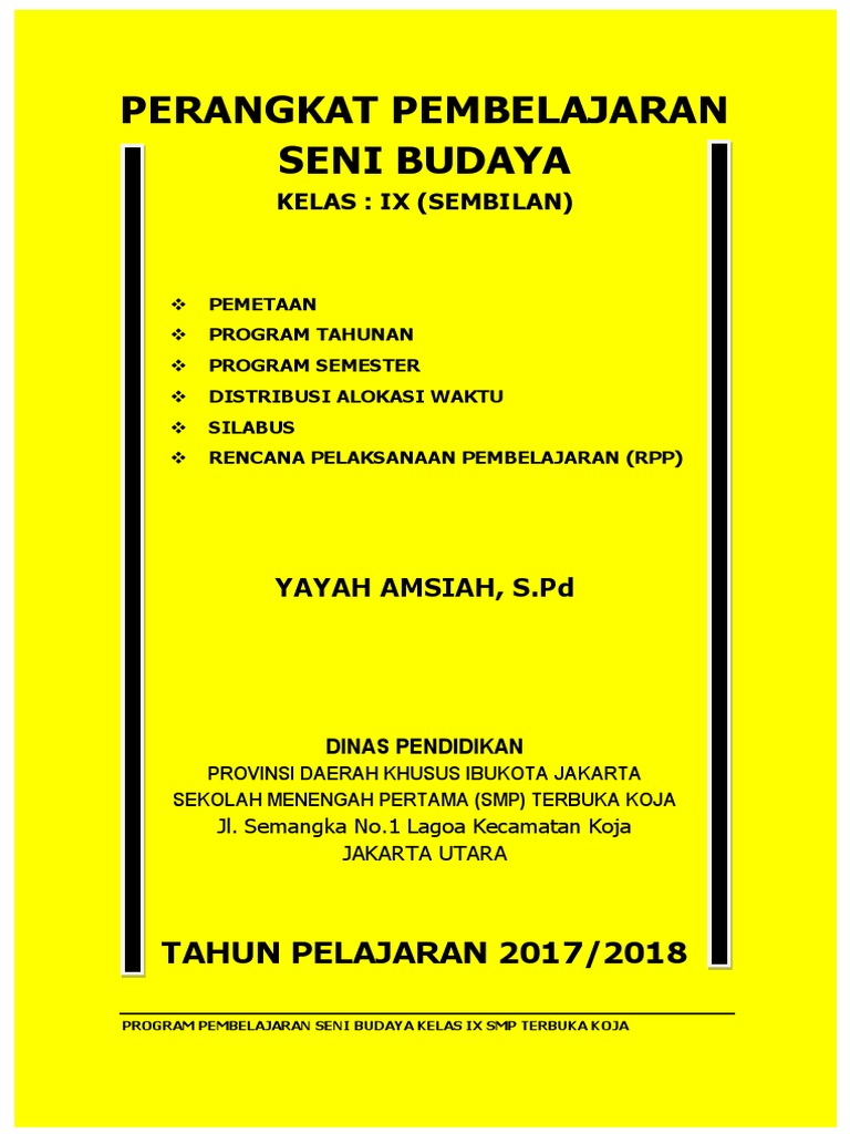 Pada Kesempatan kali ini Berkas Sekolah akan mencoba membagikan Perangkat Pembelajaran Khususnya Mata Pelajaran Seni Budaya yang mungkin bisa dijadikan bahan Referensi atau Panduan dalam melaksanakan Kegiatan Pembelajaran kepada peserta didik khususnya mata pelajaran Seni Budaya. Ifah Sholeha SPd NIPNIK - Sekolah. Perangkat tersebut masih menggunakan format Kurikulum Tingkat Satuan Pendidikan KTSP Tahun 2006.