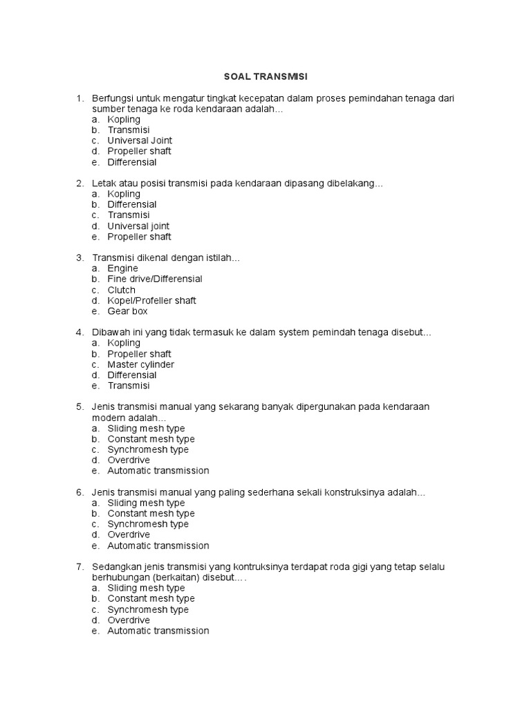 Soal transmisi otomatis dan kunci jawaban. Dan yang pastinya contoh soal yang saya berikan ini ada kunci jawabannya jadi bisa digunakan untuk menguji pengetahuan kalian. Dengan berbagi pengalaman akan membuat kita bertambah wawasan. Di artikel ini terdapat lebih dari ratusan soal yang nantinya akan diupdate secara berkala.