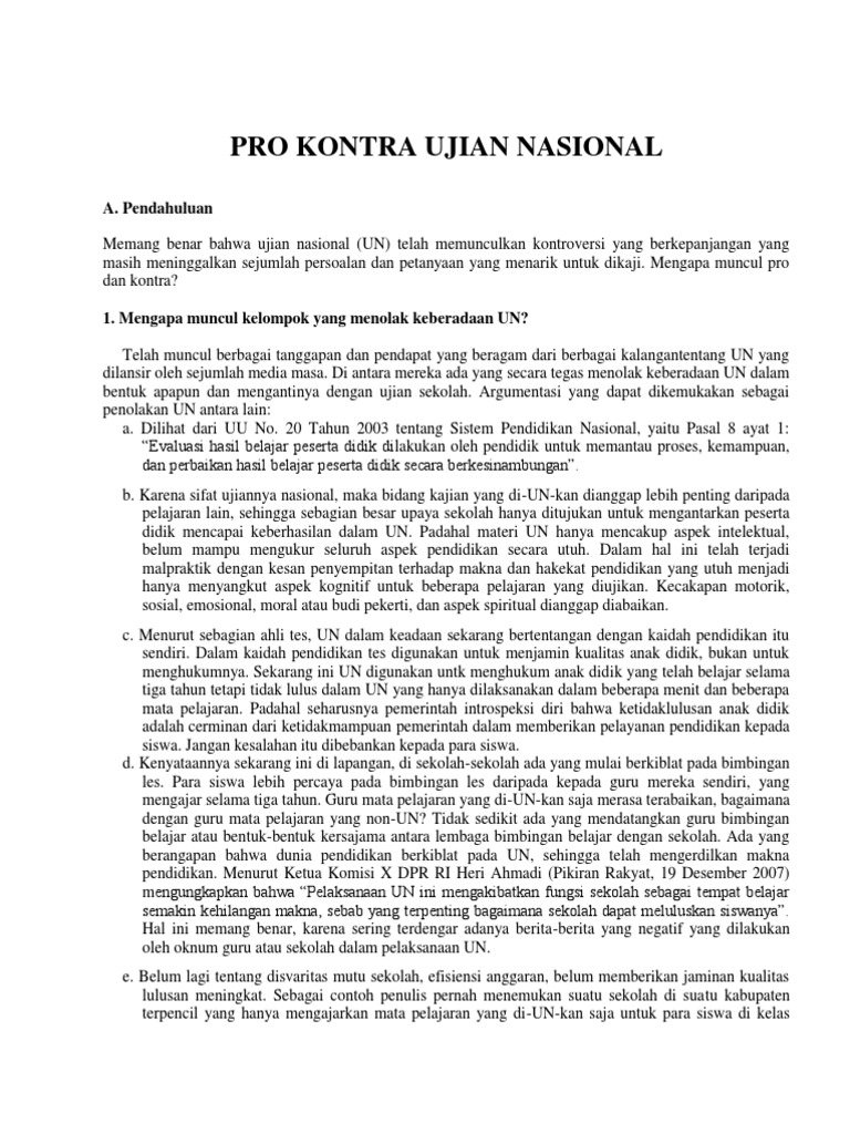 Pro-Kontra UN Dihapus. Argumen pro kebijakan ini lebih banyak daripada yang kontra mungkin. Di sisi lain banyak pihak yang pro dan kontra akan wacana penghapusan Ujian Nasional ini.